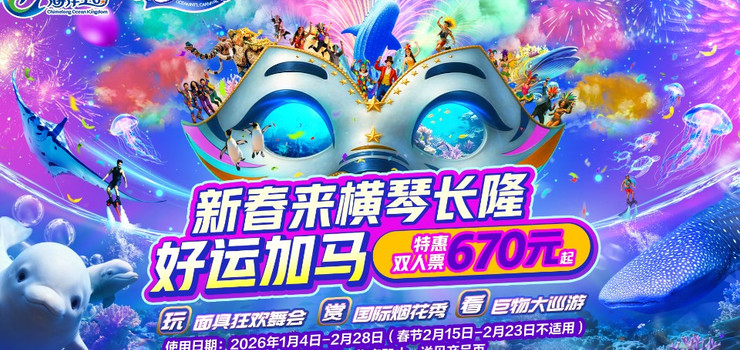 海洋保卫战精彩演出,呈现150架无人机表演、大型烟花表演、绚丽的激光与宏大的爆破场景,喷泉汇演、高难度的水上飞人演出,特技摩托艇与“鲸鲨”飞驰,俨然一部好莱坞实景大片,打造视听冲击力十足的感官盛宴。您又怎能错过?横琴海是集休闲和浪漫於一身的中心湖区。绕着湖畔前行,您可欣赏到横琴海的优美景色,亦可在附近多间风味餐厅和家人朋友享用美食、聊天欢聚。这里更是欣赏花车巡游和晚上烟花汇演的美妙地点,为您与挚爱留下温馨的回忆。