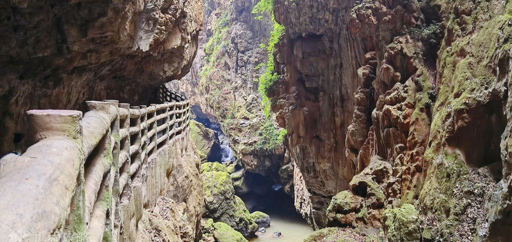 荫翠峡位于宜良九乡,两壁错落排挂的钟乳石群,整条峡长1000米,泛舟其间,令人流连。两面峭壁,绝立于万斛青翠上;半江春水,蜿转于深山密林中。流水淙淙,橹声悠扬,峡谷中水显出美丽的粉蓝色,染碧了游人的倒影,更映照出青天如帐,白云似舟。