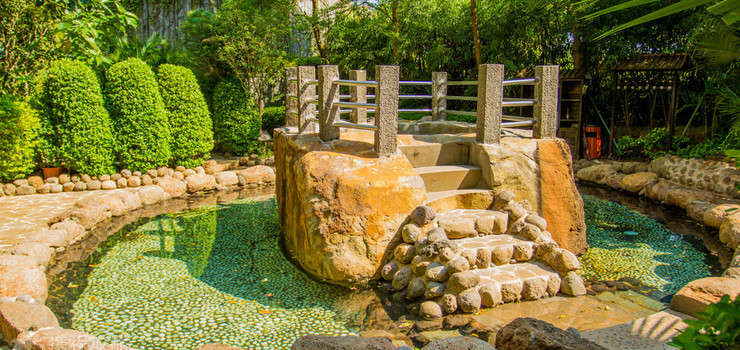 樟树湾温泉露天温泉区含1个大人游池、1个儿童游池、50个大小不一的温泉池、2个汗蒸房、1个热石板区。
