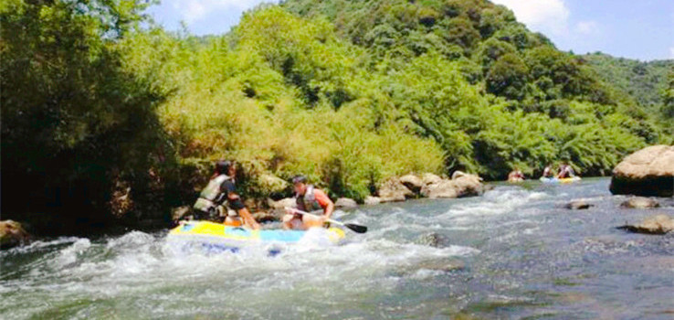 漂流全程8.5公里,漂流时间约为90分钟,夏秋两季是漂流的黄金时段。漂流河断受山地、河谷的影响,河面时而宽,时而窄;河水时而汹涌奔腾,时而温柔平静;河岸苍岩壁立,奇峰怪石,古木修竹,宛如画卷;君若乘筏漂流,蜿蜒而下,神情飘逸。两岸既有高耸的雄山,繁秘的原始深林,也有客家人居住的村庄。艇在水中漂,美景在两岸走,与激流险滩亲密接触,既刺激而又无险。