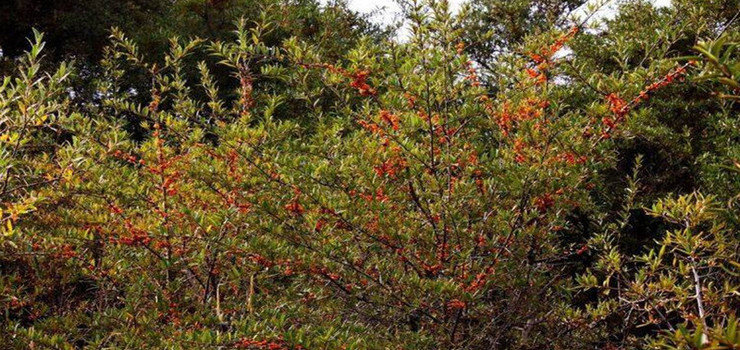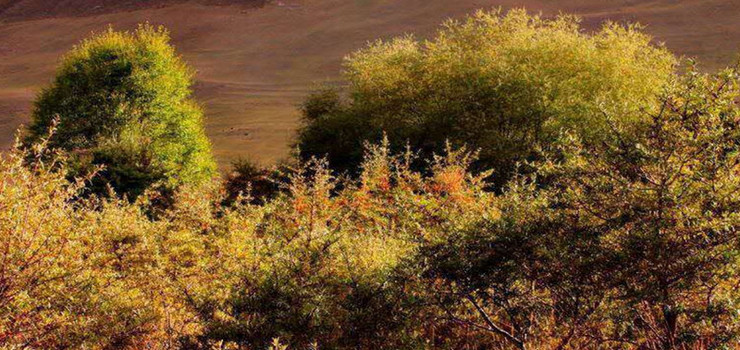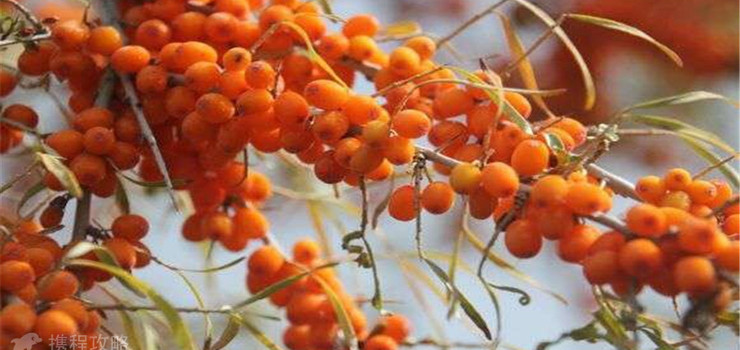 春暖花开时节,沙棘林中绿草、绿树、成荫;而当秋季来临,淡红的沙棘果成饼、成串、成堆,挂满指头,煞是诱人,那成片、成林的红绿相间景象甚是壮观,与沙滩、河流、远处的雪山融为一体,相互应衬,景观奇特、恢弘。