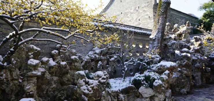 造园者将冬景安排在南墙之下,几乎终年不见阳光,远远望去似积雪未消,地面也用白石铺成。又在南墙上开四行圆孔,利用狭巷高墙的气流变化所产生的北风呼啸的效果,立增冬天大风雪的气氛。还堆塑出一群大大小小的雪狮子,或跳或卧,或坐或立,真是严肃又可爱。冬山宜居,仨俩知己,聚在这座面山而筑的透风漏月厅里,围炉赏雪、夜话。