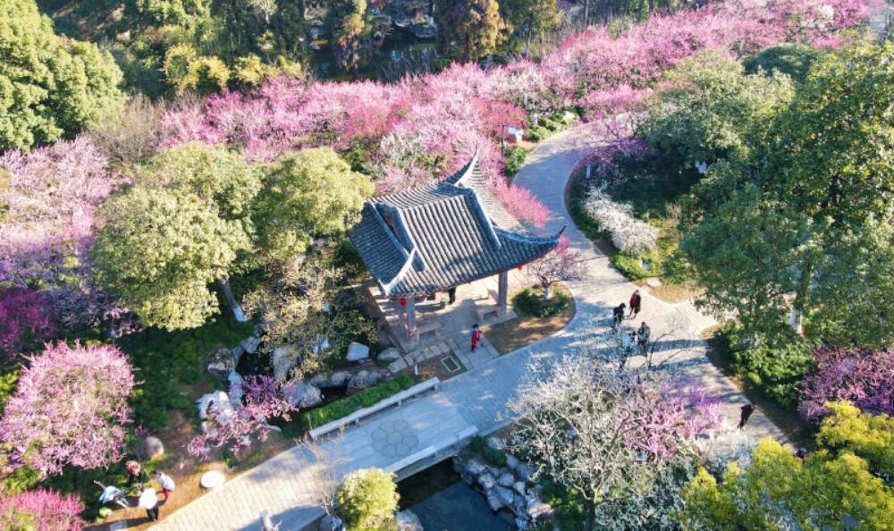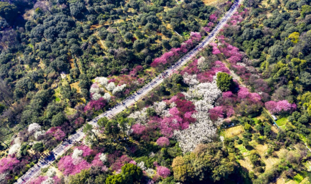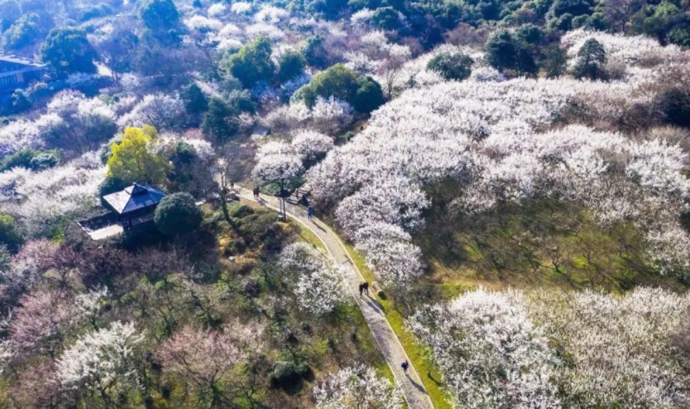 超山位于塘栖镇区内,以梅而闻名天下,与无锡梅园、苏州邓尉并列为近现代三大观梅胜地。从宋代咸亨年间何熹之的《重修福臻寺并增建钟鼓二楼记》的碑记中,可以看到超山的梵刹始于唐代之后的五代后晋时期(936—946),距今有一千多年的历史了,超山植梅的历史也始于此。主峰超山,海拔260米,因超然突立于皋亭,黄鹤之外故名。