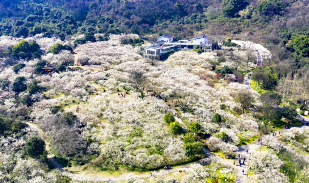 超山风景区景区面积为5平方公里,主峰超山,海拔260米,因超然突立于皋亭,黄鹤之外故名。以观赏“古、广、奇”三绝的梅花而著名。每当初春二月,花蕾爆发,白花平铺散玉,十余里遥天映白,如飞雪漫空,天花乱出,故有“十里香雪海”之美誉,为江南三大探梅胜地之一。中国有五大古梅,超山就有其二——唐梅和宋梅。