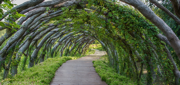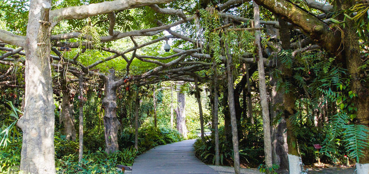 广西药用植物园坐落在距南宁市区8公里的东郊山峦,占地200多万平方米。园内林木苍翠,藤蔓纵横,加上棚架点缀其间,小桥流水更添雅趣。