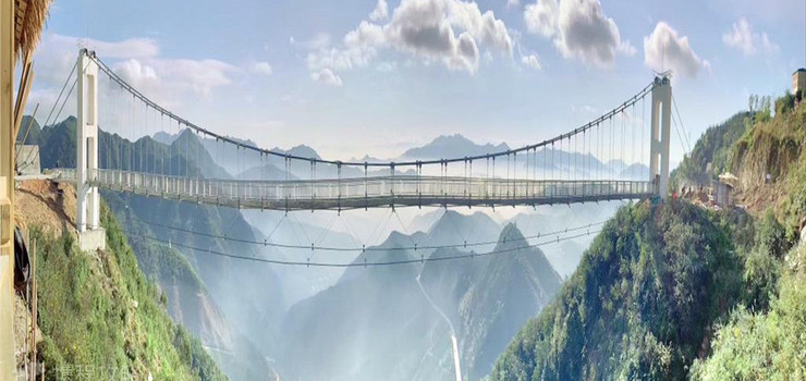 全透明玻璃桥凌空飞架在两峰之间,海拔900米,全长156米,站在桥上,晴日暖风看尽山间繁茂,氤氲缭绕如梦蓬莱仙境,步步惊心。