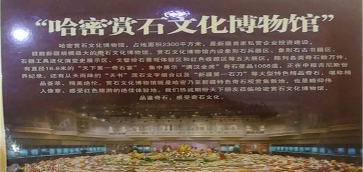 哈密赏石文化博物馆内分设象形石兵器(中国工农红军兵器发展史)、象形石古书籍、石器工具进化演变史、戈壁捡石景观体验区和“红色收藏”展示区等五大系列展区,陈列各类奇石10000余件。