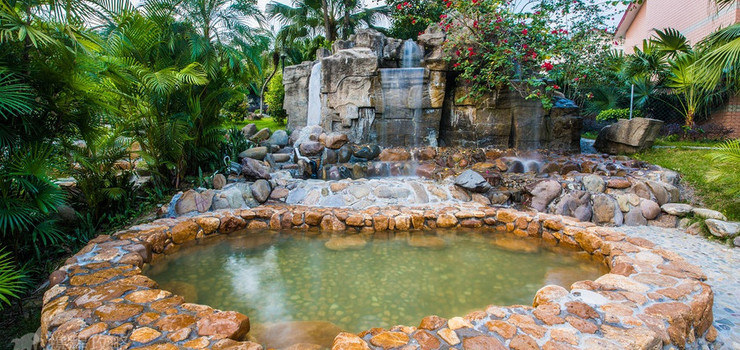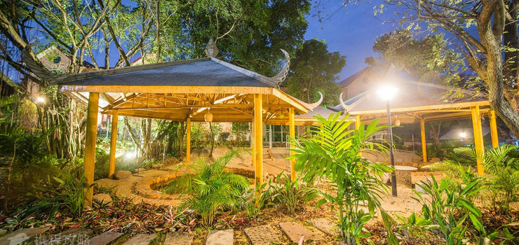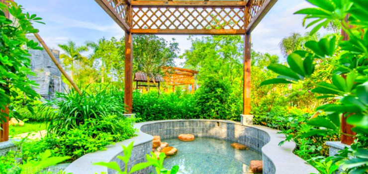 温泉区按照日本园林风格设计,鹅卵石筑成圆池超有feel,周边绿树成荫,随时都能感受到大自然的味道。