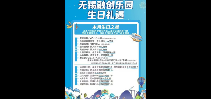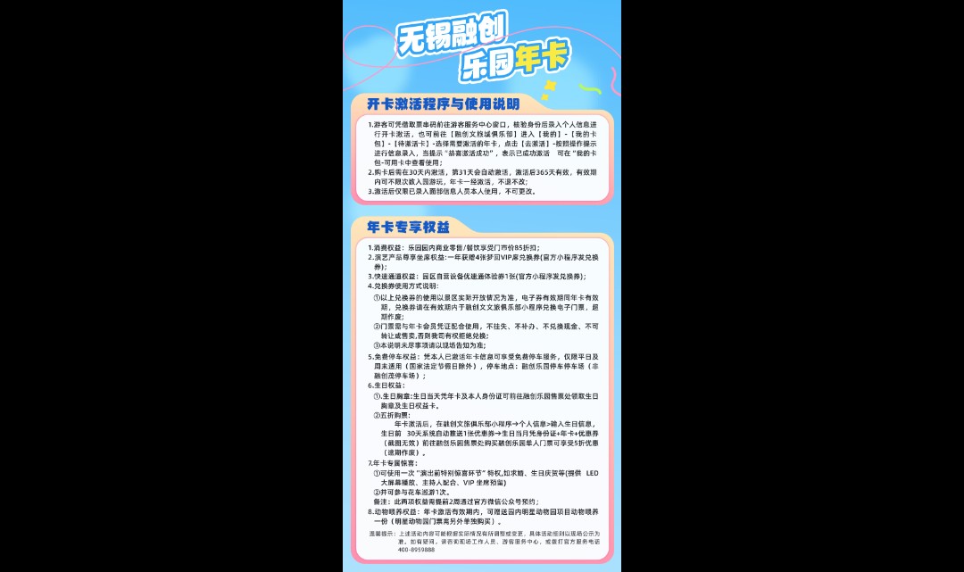 ⑤无锡融创乐园欢乐套票可游玩园内以下项目:【飞越江苏、工厂历险、西洋惊涛、雄鹰飞翔、吴王宝剑、吴王之盾、龙舟飞渡、竹林飞旋、吹糖转马、狮王迎宾、欢庆酒杯、游园小火车、碰碰小虎、欢喜爆竹、蒸汽奇旅、花茶摇曳、疯狂齿轮、七彩花灯、彩陶转盘、超级马达、云端漫步、蚱蜢跳跳、飞旋竹篮、蜜蜂飞舞、自然探秘、快乐垂钓、纸箱奇旅、魔法爆炸、妈妈咪鸭冲浪记、霞客漂流、大湖秀、自然探秘(3D电影)—— 恐龙王】,项目具体开放情况视天气、设备例行维护等因素影响以当日现场公示为准。