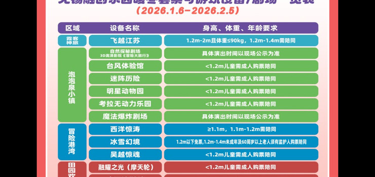 ②项目体验时会有身高、体重、年龄、陪同等要求,请各位游客按照项目须知选择游玩,具体内容以园区内公示牌为准;