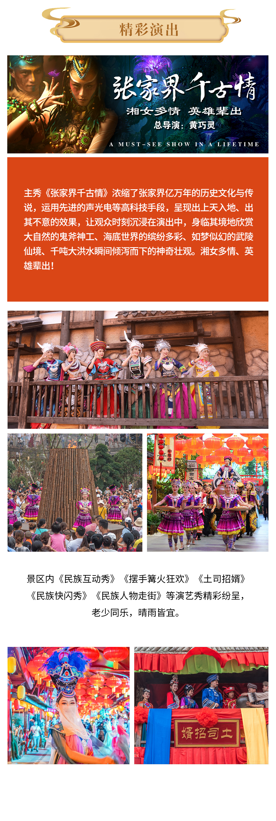 核心演出《张家界千古情》是一生必看的演出,用上天入地、出其不意的舞台手段让观众时刻沉浸在演出中,身临其境地欣赏大自然的鬼斧神工、海底世界的缤纷多彩、如梦似幻的武陵仙境,湘女多情、英雄辈出! 还有《民族迎宾巡游》《摆手篝火狂欢》《土司招婿》《江湖快闪秀》《市井走街》等演艺秀精彩纷呈。张家界千古情景区,给我一天,还你千年!