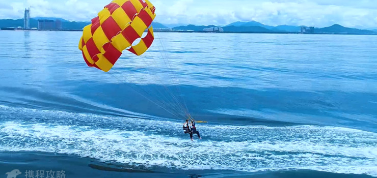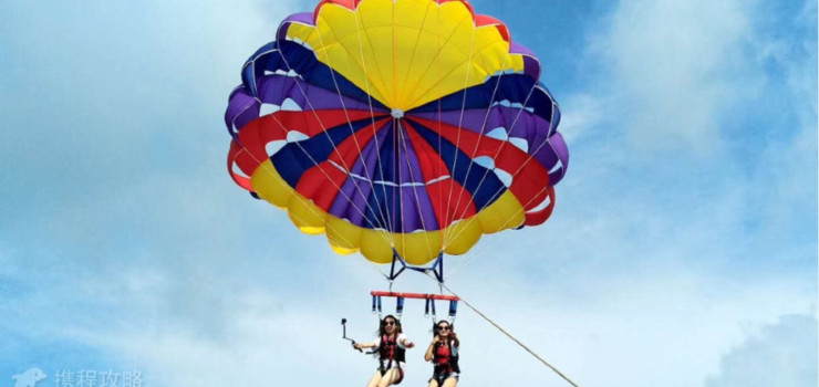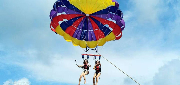 这是一项极富刺激性的海上运动。拖伞从起飞到降落,一切动作均在拖伞船上完成。起飞前工作人员会为你穿好降落伞,系好拖绳,随着拖伞船的加速,穿着降落伞的你会因空气阻力而升空,降落伞在空中绽开, 逐渐升高,最高可达20米,可单人飞或双人飞,并可蜻蜓点水一至二次。