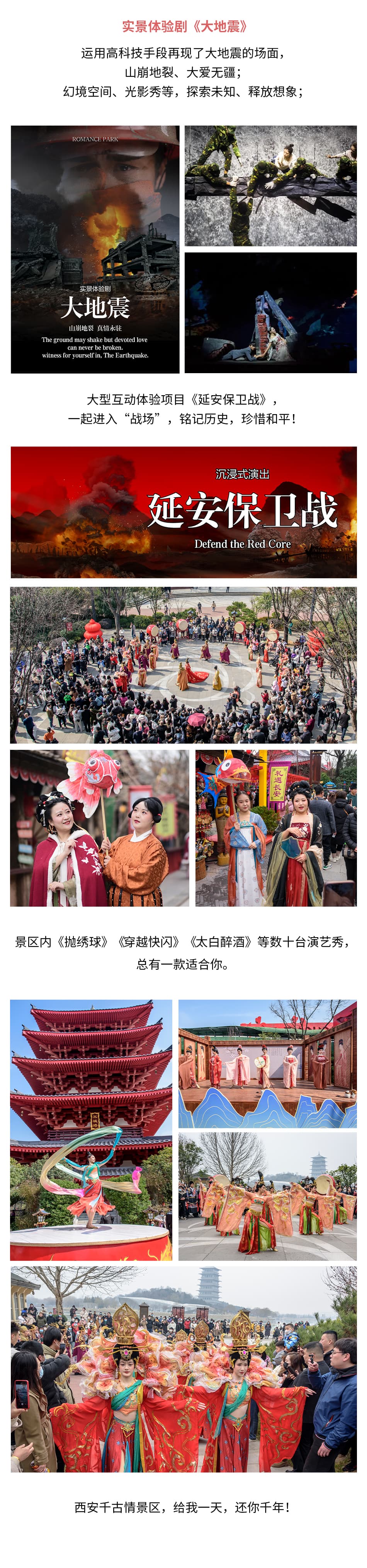 沉浸式裸眼3D“幻境空间”,坐上虚拟过山车穿越丛林,驾驶飞船穿行宇宙空间,跟随小海龟海洋冒险……八种穿越奇遇,飞一般的探险旅程,带你上天下海入地。行浸式网红打卡点“光影秀”,一个七彩斑斓的梦幻世界。遨游无边宇宙、仰望璀璨星空、穿梭奇幻丛林……情侣闺蜜、亲子遛娃、全家出游皆可打卡,好玩又出片。大型互动体验项目《延安保卫战》,一场气壮山河的鏖战,一次涤荡心灵之旅,一起进入“战场”,铭记历史,珍惜和平!景区内《旋鼓舞》《花间舞》《国风快闪秀》《簪花仕女图》等数十台演艺秀,总有一款适合你。