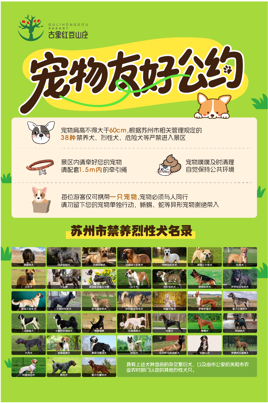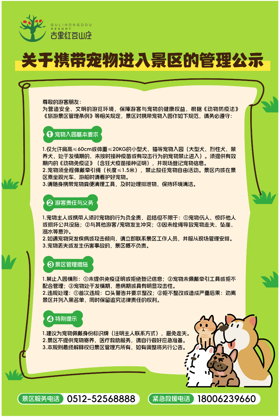 4、为了提高景区服务质量,保障游览安全,给游客营造优质舒适的旅游体验,古里红豆山庄景区禁止游客携带宠物入园,希望游客朋友能够遵守相关规定,文明游园。