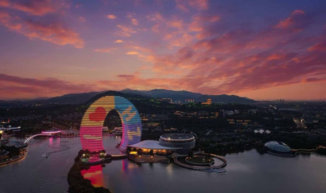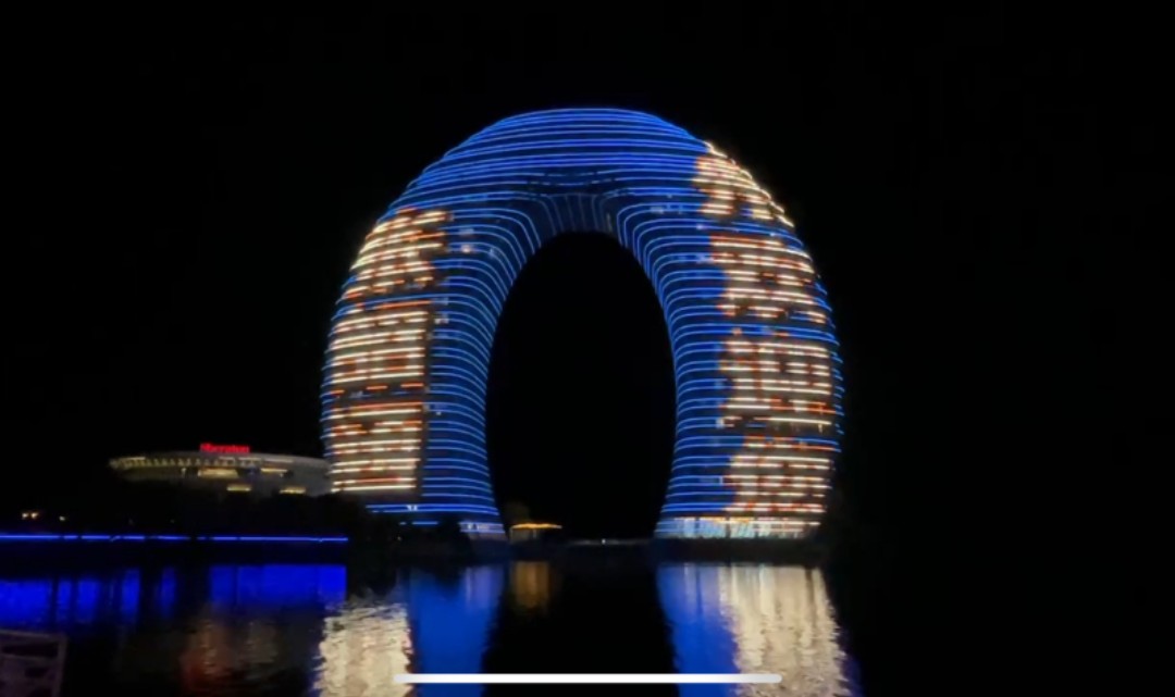月亮湾一面依山,三面傍水,岸线曲折,像一轮弯弯的月亮,故名“月亮湾”。岛上夏坞峰高高耸立,森林茂盛,绿树长青。岛占地约180亩,建有林场、茶园、栗园、狩猎园、品茗阁、接待厅以及民俗风情园等。