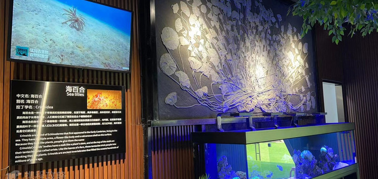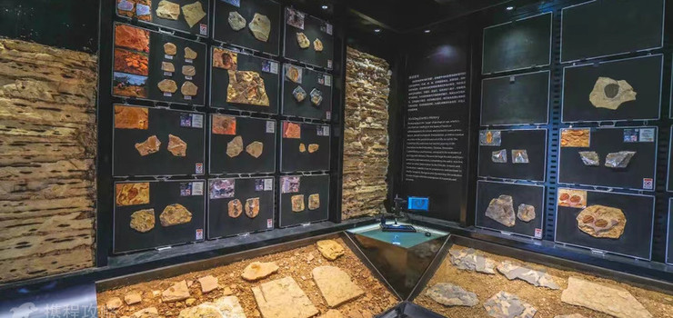 我们这个馆与其它别的馆造的意义是完全不同的,我们意义代表了地球的5次演化,5次爆炸和生物演化的过程,从无脊椎类走向脊椎类的过程,我们看到这边的地质墙,是从寒武纪的地质层中开采这边有开采视频,如何开采,挖掘,包括到如何寻找化石,我们现在看到的破面墙,就好像西瓜破开后,我们找到了健康的西瓜子一样,每个工人,每天2万下敲打寻找才可以找到一个教学标本,我们现在看到这个不完成,它属于脱壳标本,只有科研的价值,当然地质层里也有很多精品,甚至你看到的上面这些是馆藏级别的。馆藏级别是根据这个物种的分布程度和稀有程度,完整度,色彩对比度。