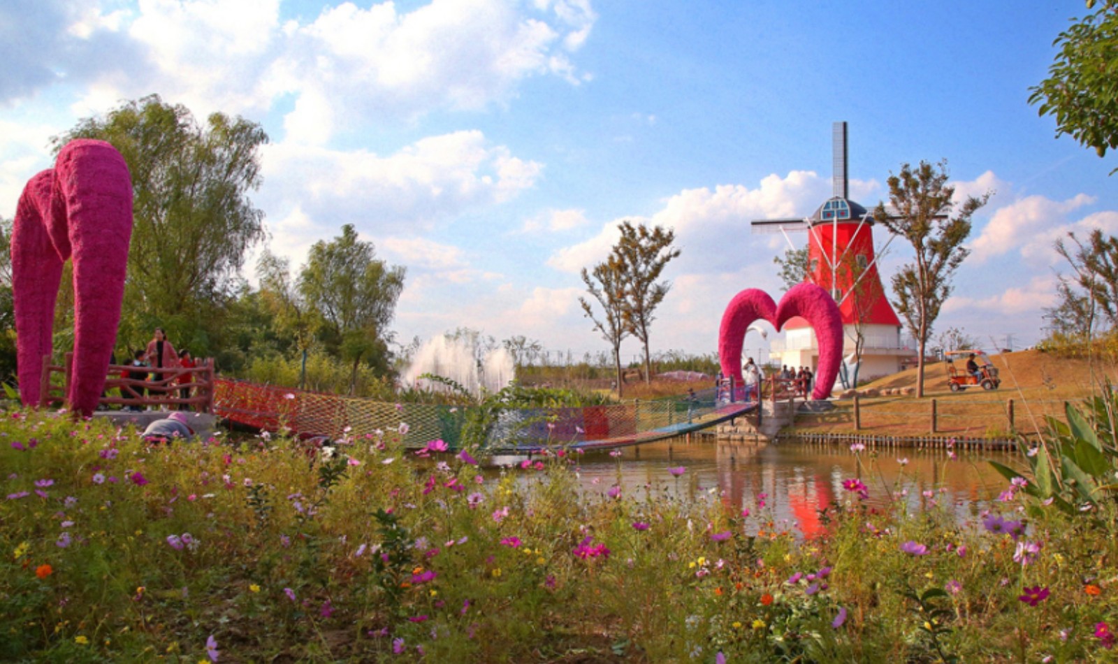 四季花海占地150亩,以花成海, 田园、风车、四季鲜花为元素、农田变花园、鲜花铺展、姹紫嫣红,徜徉浪漫花海、感受异域浪漫风情。