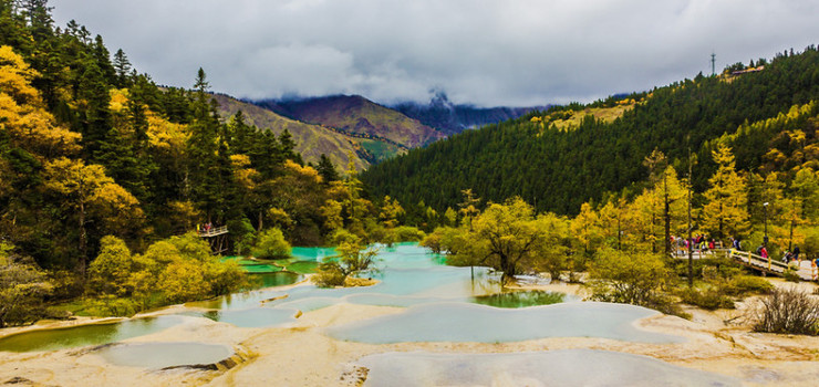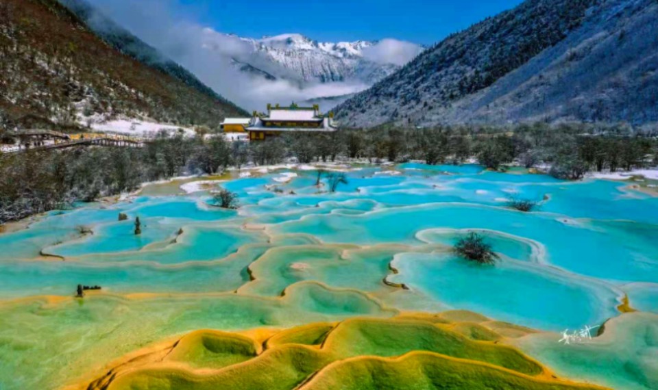 五彩池海拔3900米,位于黄龙上端的钙化彩池群,共有693个钙池,宛如五彩珍珠镶嵌在原始森林中,被誉为“人间瑶池”。这里,青山吐翠,漫步池边,无数块大小不等,形状各异的彩池宛如盛满了五彩颜料的水彩板,蓝绿、海蓝、浅蓝等等,争奇斗艳。