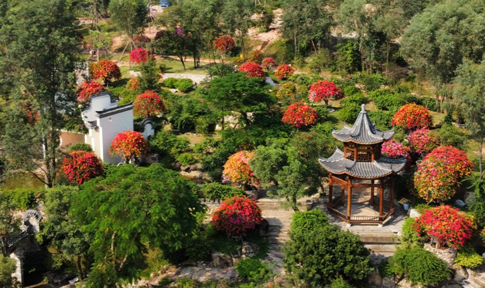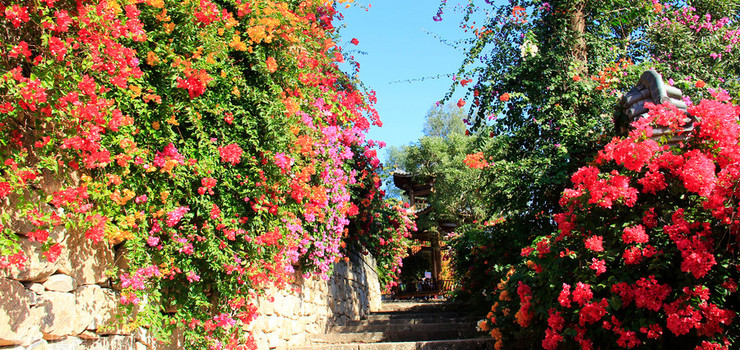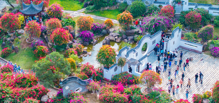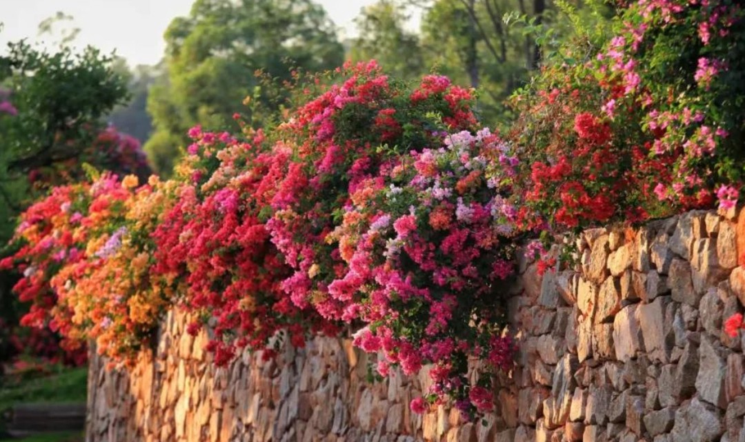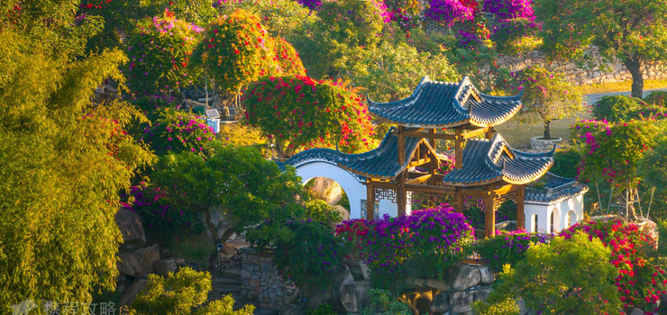 建筑与花共舞:岭南镬耳墙、镂空花窗、青砖黛瓦掩映于三角梅花海之中,古典庭院与自然野趣碰撞出独特美学。推荐打卡“曲廊烟霞”——百米拱廊被三角梅完全覆盖,行走其间如穿梭时空隧道。