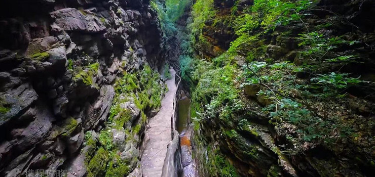 峡谷绝壁幽深陡峭,站在栈道向上仰视,只见险峰对峙,壁立千仞,高耸入云的悬崖摇摇欲坠,几欲合拢。上边的蓝天形成一条细长曲线,“一线天”名副其实。