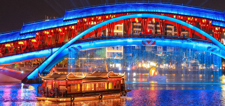 乘坐科技与雅致相结合的定制化游船,在里水河缓缓前行,在绚丽的科技光影加持下,夜晚变得梦幻迷离,仿佛置身花月幻境。乘船欣赏两岸夜景的同时,一段婉约动人的南粤爱情故事,以一幕幕唯美科技光影秀、实景舞蹈秀的形式徐徐展开。