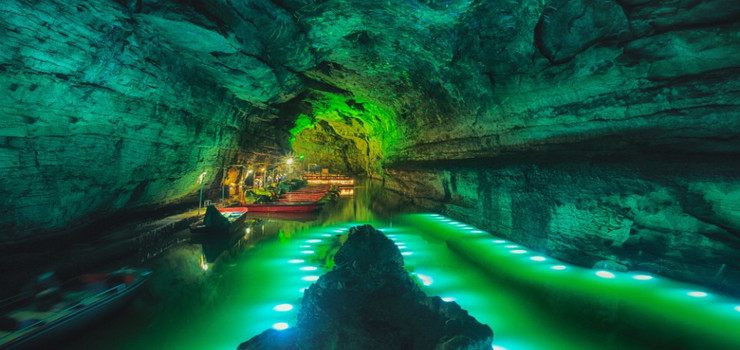 响水河是黄龙洞第二层的一条阴河,全长2800米,目前乘船游览其中的一段为800米。荡舟响水河,沿途充满神秘诱惑的风景,如龙王金盔、海螺吹天等景点都值得您慢慢欣赏和品味。空谷幽邃,岸危穹高。忽仰忽倾,若明若暗,恍若回到混沌的远古时代。