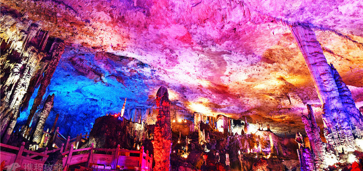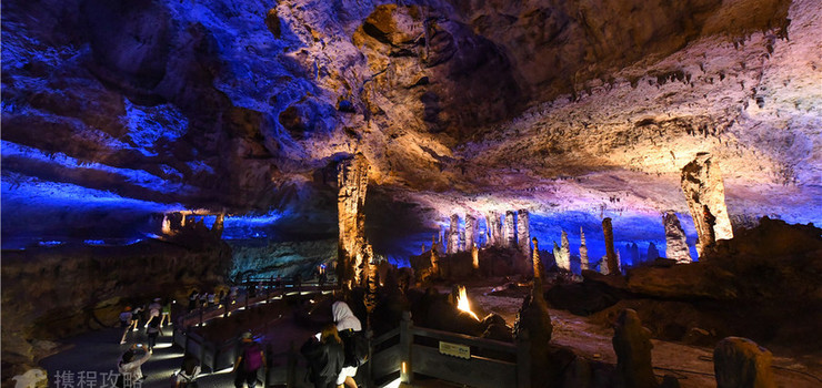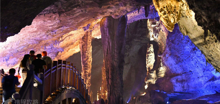 溶洞里面的景观主要是由石笋、石钟乳和石柱构成的,从下面长上去的形状就是石笋,其中特别粗大的叫石柱,而从洞上方往下悬挂的就是石钟乳(又叫钟乳石),其中顺壁而下的较宽的叫石幔。 右边有一根形状奇特的石笋,整体看起来,它就特别像北京天安门前的华表。