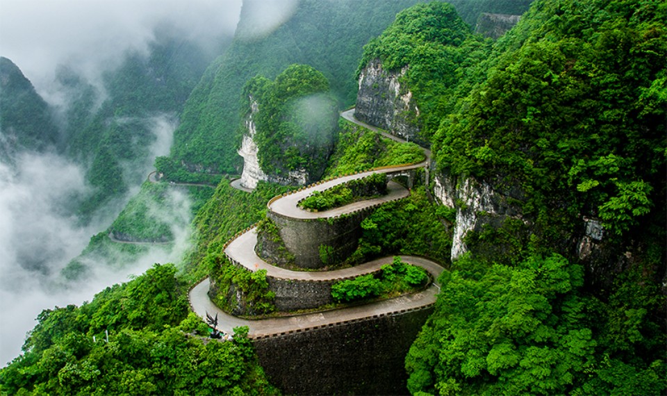 通天大道,扶摇直上九重云霄,直逼天门仙境,惊险奇崛,荡气回肠,是祈福朝圣天门仅有的通道。全长10.77公里,近1100米高海拔落差,密布99道呈180°旋转急弯,环环相扣,层层叠叠,犹如飘扬的玉带萦绕苍穹。