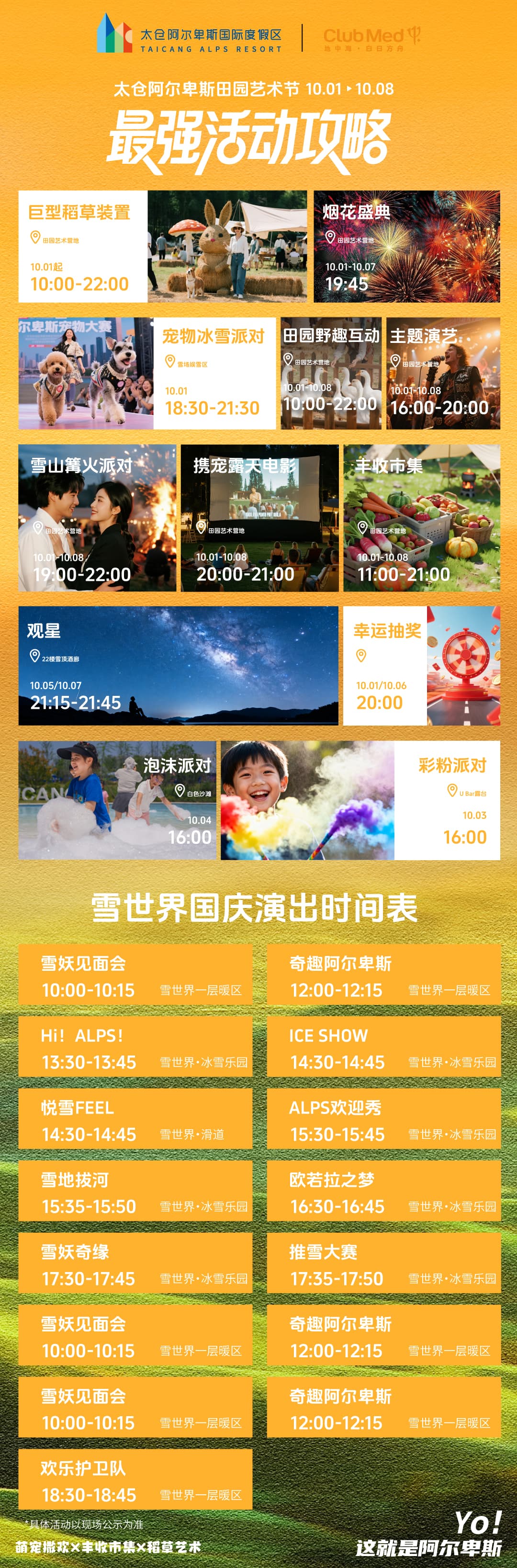 同时,度假者还将观赏到多场精彩震撼的演绎秀:奇趣阿尔卑斯、欧若拉之梦、欢乐护卫队、ALPS泼雪派对、雪妖奇缘、花样滑冰秀、欢乐互送……,在浪漫、梦幻、神秘、欢乐的氛围中收获纯正的阿尔卑斯式冰雪体验!