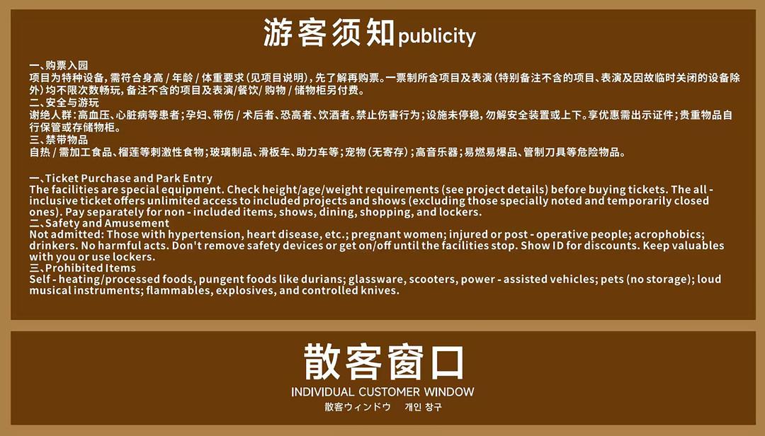 ②为确保游客安全游玩,乐园如遇恶劣天气、特殊活动、游客饱和、设备故障检修等原因调整开闭园时间:项目或表演开放时间,以官方公告为准。