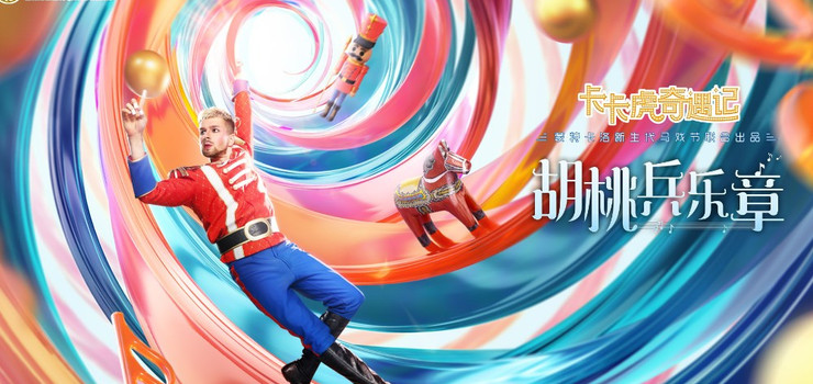 大人小孩都喜欢的《胡桃兵乐章》,随着音乐的响起,一群玩具士兵仪仗队,身着华丽的制服列队出现在视线中,在乐手的带领下,胡桃夹子兵们,步伐整齐划一,展现隆重的仪式感,向来到童话王国的朋友们致以崇高的礼节。与此同时舞台变成了一个绚烂的庆典场景,士兵们骑在木马上跳舞,仪仗队在奏乐,一同欢庆此刻的开心时光。节目的精彩部分要数,胡桃夹子士兵展示了高难度的高空技巧。马戏艺术家仿佛摆脱了束缚与地心引力,以非凡的身姿和轻盈的体态在空中翩翩起舞。艺术家与道具金球之间似乎有着神秘的感应,金球在空中旋转滚动、翻飞,整场演出如同天使在夜空中与月亮嬉戏,仿佛进入童话般的世界。《彩羽之舞》是《卡卡虎奇遇记》中一场充满魔幻和色彩的鹦鹉表演节目。