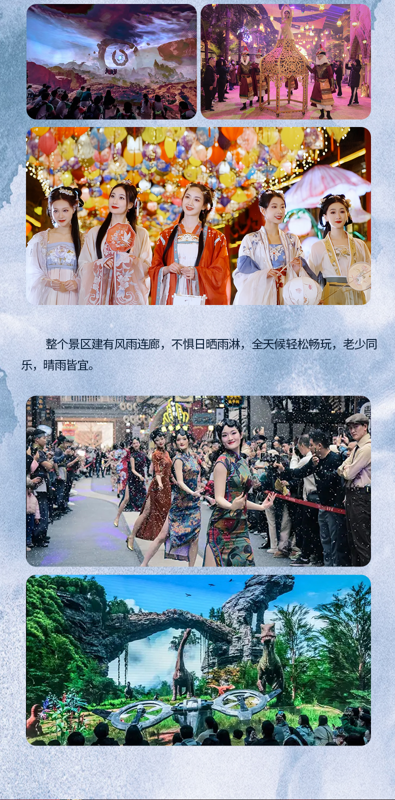 整个景区建有风雨连廊,不惧日晒雨淋,全天候轻松畅玩,老少同乐,晴雨皆宜。