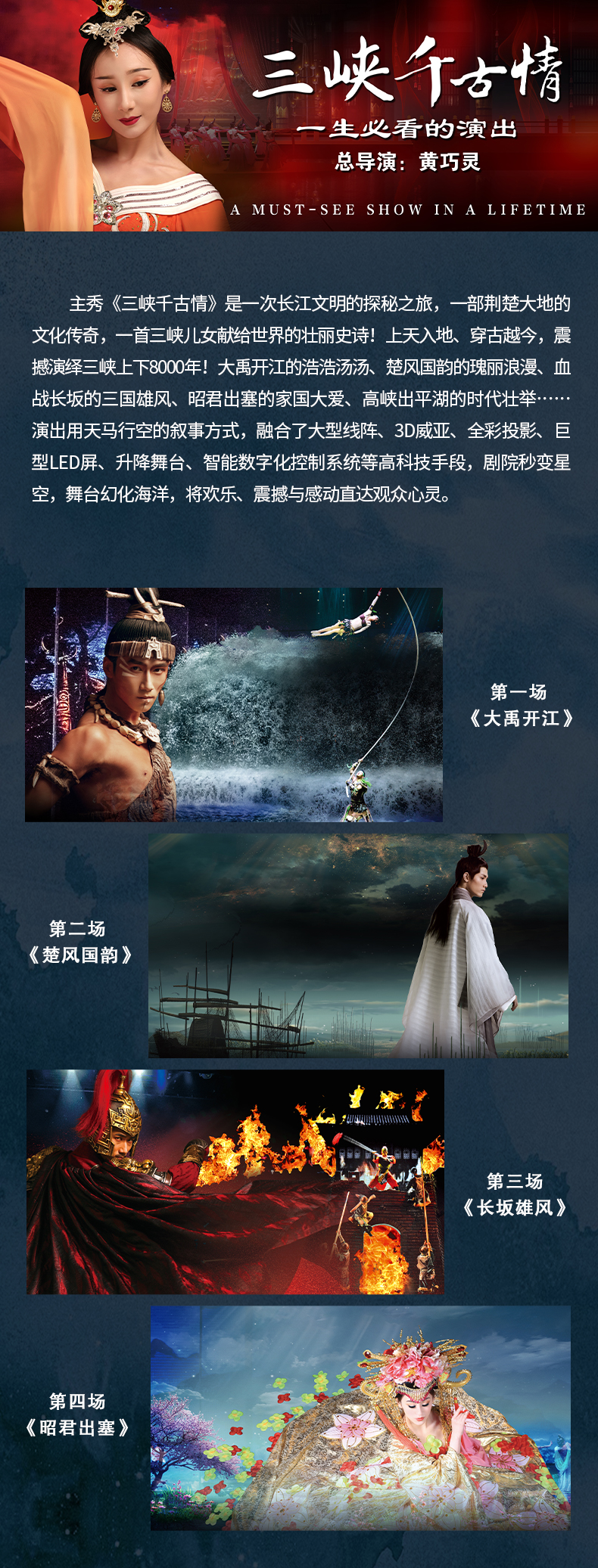 上天入地、穿古越今,《三峡千古情》震撼演绎三峡上下8000年!大禹开江的浩浩汤汤、楚风国韵的瑰丽浪漫、血战长坂的三国雄风、昭君出塞的家国大爱、高峡出平湖的时代壮举……演出用天马行空的叙事方式,融合了大型线阵、3D威亚、全彩投影、巨型LED屏、升降舞台智能数字化控制系统等高科技手段,剧院秒变星空,舞台幻化海洋,将欢乐、震撼与感动直达观众心灵!