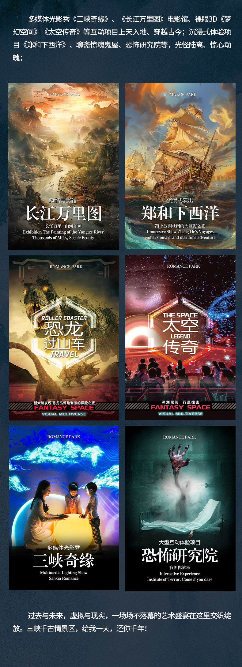 多媒体光影秀《三峡奇缘》、VR体验项目《太虚幻境》《长江万里图》电影馆、裸眼3D《梦幻空间》《太空传奇》等互动项目上天入地、穿越古今。沉浸式体验项目《郑和下西洋》、聊斋惊魂鬼屋、恐怖研究院等光怪陆离、惊心动魄。