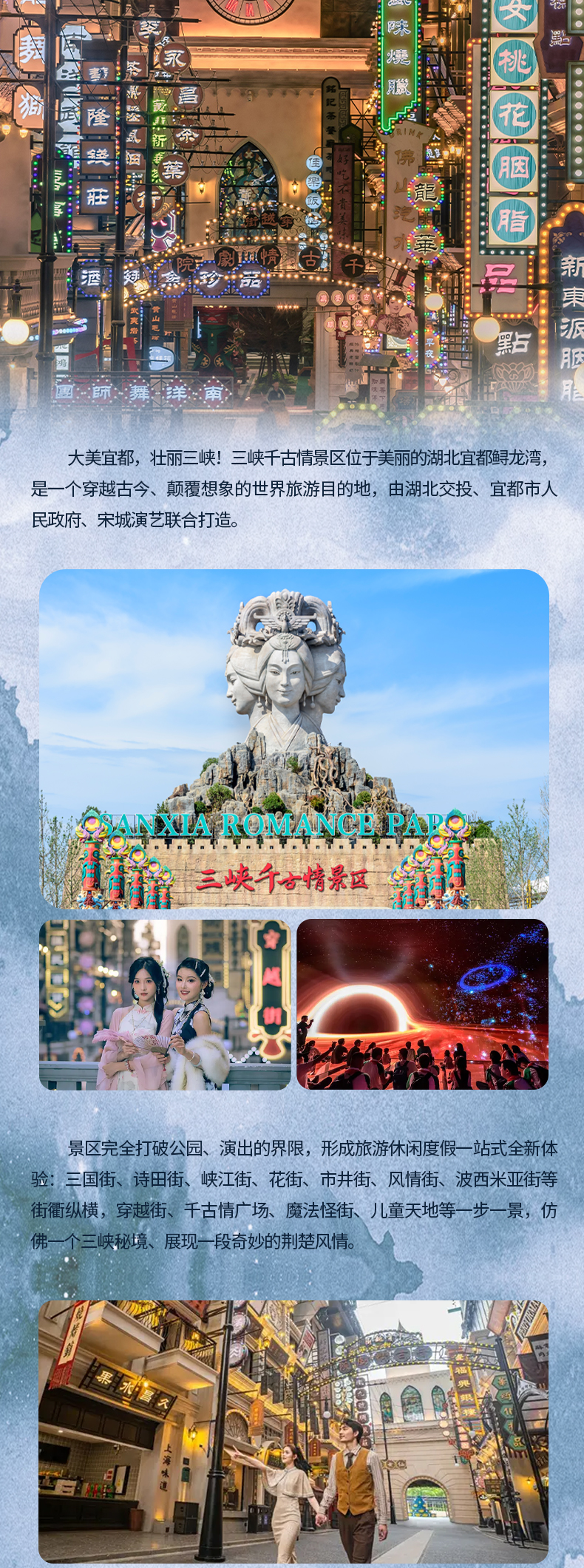 景区完全打破公园、演出的界限,形成旅游休闲度假一站式全新体验。三国街、诗田街、峡江街、花街、市井街、风情街、波西米亚街等街衢纵横穿越街、文化广场、魔法怪街、精灵谷等一步一景,仿佛走进三峡秘境,邂逅一段奇妙的荆楚风情。