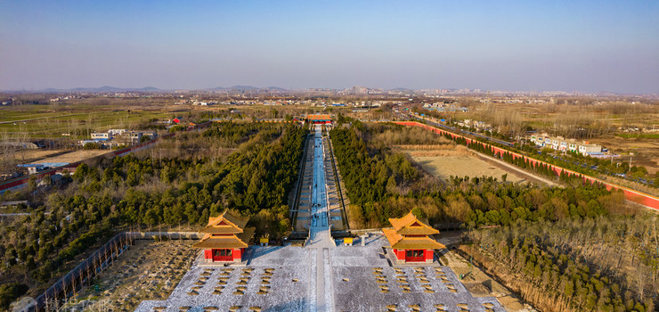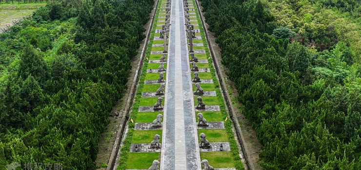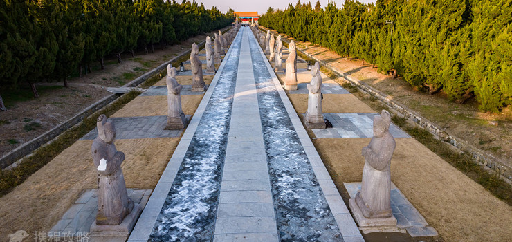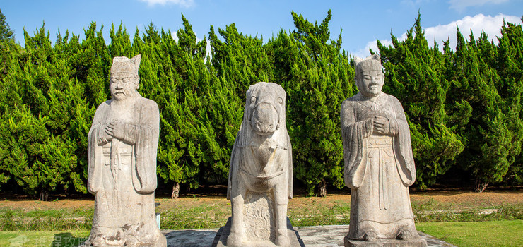 皇陵神道总长257米,石像生32对,刻工精细,姿态纷呈,威武庄严,栩栩如生,石像生数量之多,其艺术风格奇妙,堪称上承宋元,下启明清的大型石雕艺术精品。