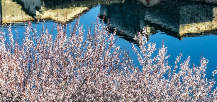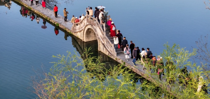 无边细雨湿春泥,隔雾时闻小鸟啼;杨柳含颦桃带笑,一边吟过画桥西。垂柳依依的南湖边,李慕白牵马从石拱桥上缓缓走过;玉娇龙持剑飞身掠去,在宛如镜面的月沼上划出一道波痕……这里是电影《卧虎藏龙》的拍摄地,这里是绘画人群的写生胜地,这里是中国画里的乡村,这里是——宏村。